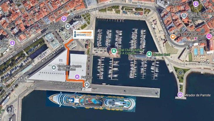 When you disembark from your ship, you must make your way to the cruise terminal exit. Once you get out, turn on the left and then take the first on the right. Walk straight ahead for about 3 minutes between the Palexco Exhibition Centre (on your right) and the Los Cantones Village Shopping Centre (on your left). Before the Taxi stop you will meet our staff "WE ARE THE YELLOW TEAM" (Avenue do Porto 3, 15003 La Coruna). Thank you. "